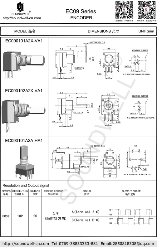 | 主要規(guī)格: | 外形尺寸:9.5mm; 工作溫度:-20℃~80℃; 額定功率:DC 5V 0.5mA; 定位數(shù):20個(gè); 脈沖數(shù):10 ; 旋轉(zhuǎn)壽命:30000次以上; 開關(guān)按壓壽命:20000次以上 |