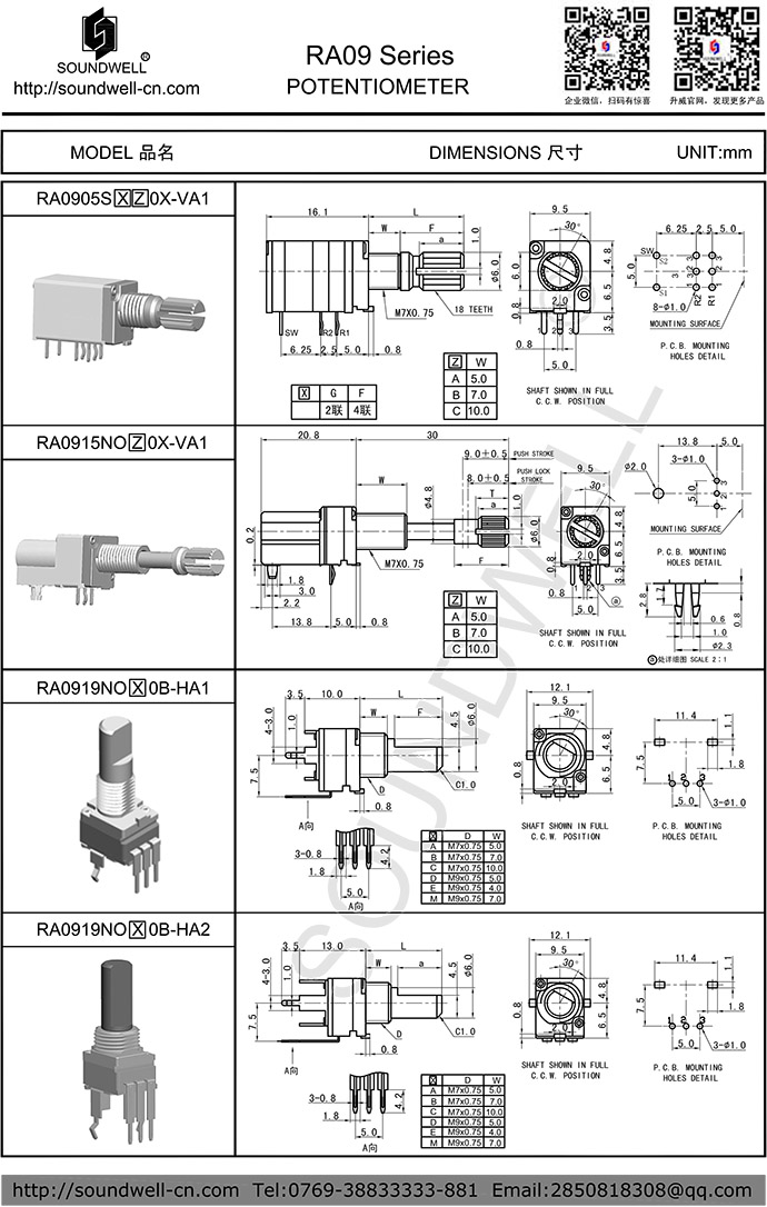Plastic packaging structure, can effectively cope with wave soldering; Good product sealing; Can be with positioning; With push switch or rotary switch; Shaft length and shape can be adjusted; Various mounting options to choose from. |
